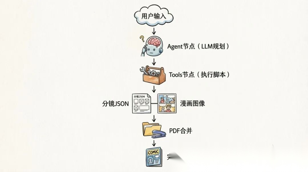 用户输入 │ ▼┌─────────────────────────────────────────────────┐│ Agent 节点: LLM 规划 + 工具调用 ││ 输入: 用户请求 + 工具定义 ││ 输出: 结构化工具调用 │└────────────────────┬────────────────────────────┘ │ ▼ ┌──────────────────────┐ │ Tools 节点: 执行工具 │ └──────────────────────┘ │ ┌────────────┴────────────┐ ▼ ▼ 分镜生成脚本 图像生成脚本 (generate-comic.ts) (main.ts) │ │ ▼ ▼ 分镜 JSON 文件 漫画图像文件 │ │ └────────────┬────────────┘ ▼ PDF 合并脚本 (merge-to-pdf.ts) │ ▼ 完整漫画 PDF