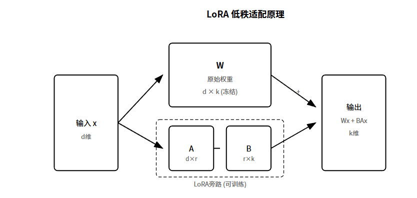 原始模型的权重矩阵是W,维度是d×k。微调时不动W,旁边加两个小矩阵A和B。A的维度是d×r,B的维度是r×k。r叫做秩,通常设成8、16、32这种小数字。