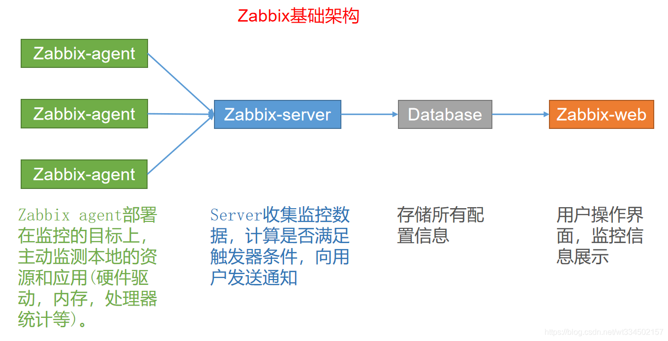 - 核心作用:存储监控配置信息(主机、监控项、触发器)、历史数据(指标快照、告警日志)。
