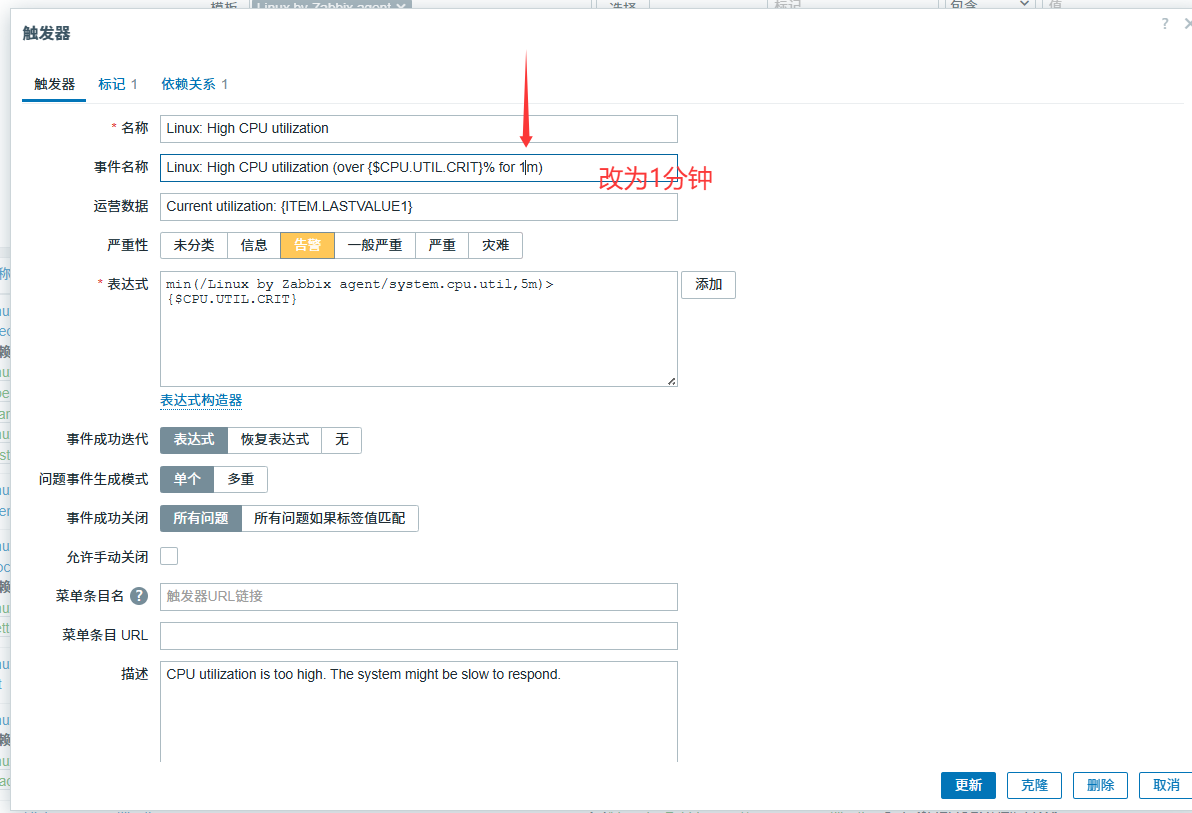 更改cpu过载时间为1分钟,方便观察