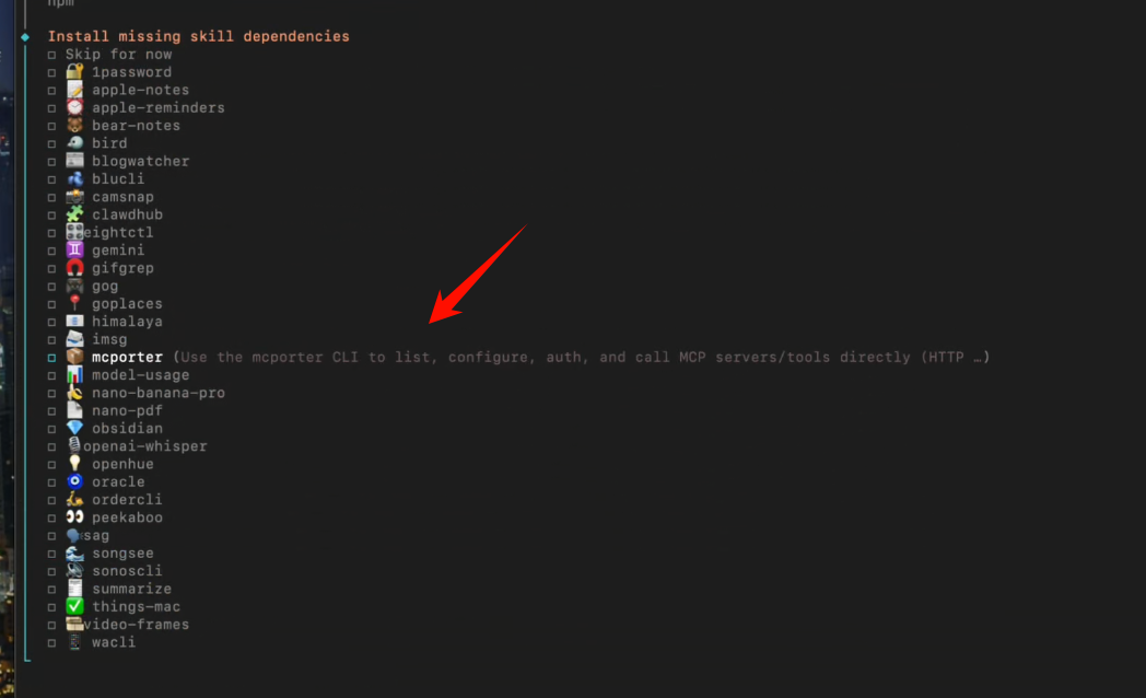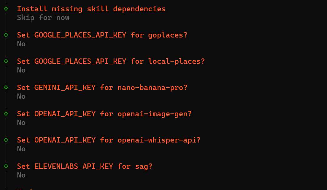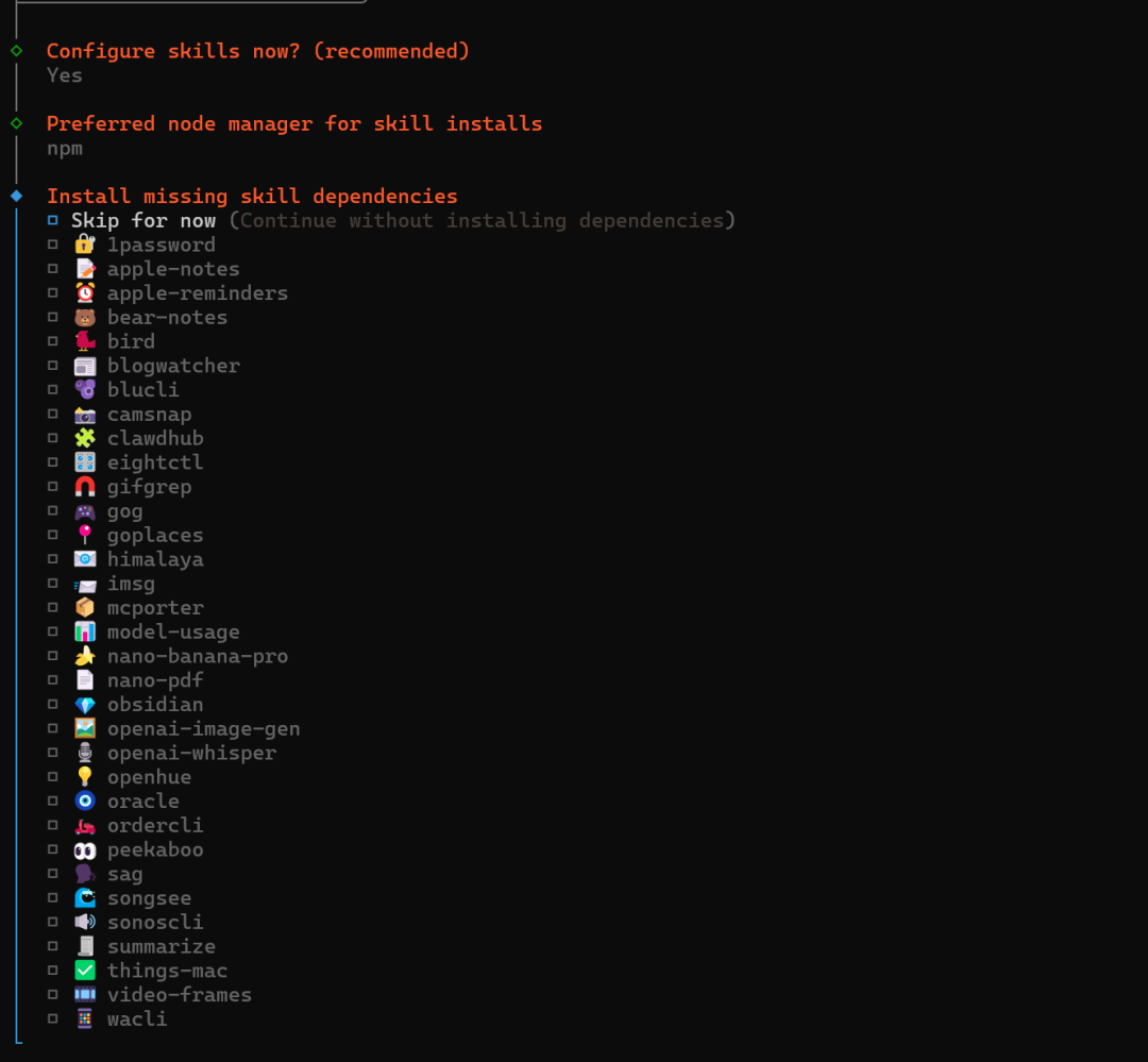 接着它会问我们要不要安装一些第三方的 API,这些并不是给 Skills 的,而是它整体可能进行许多扩展操作会用到的,我是不用的,我这里直接全部 no 了。