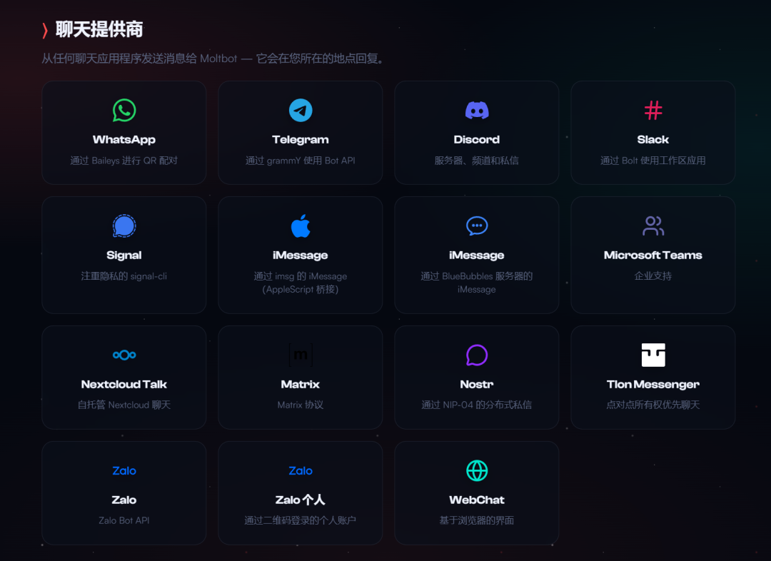 💬 可以通过 ** WhatsApp、Telegram、Discord、Slack ** 等聊天应用与你交互