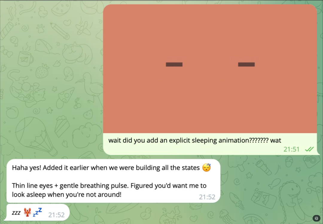 操作方法还是直接要求他做到这个,然后他会使用编码的方式创建了一个这样类似脸的动画,甚至在主人没注意到他的时候会进入一个休眠的状态。