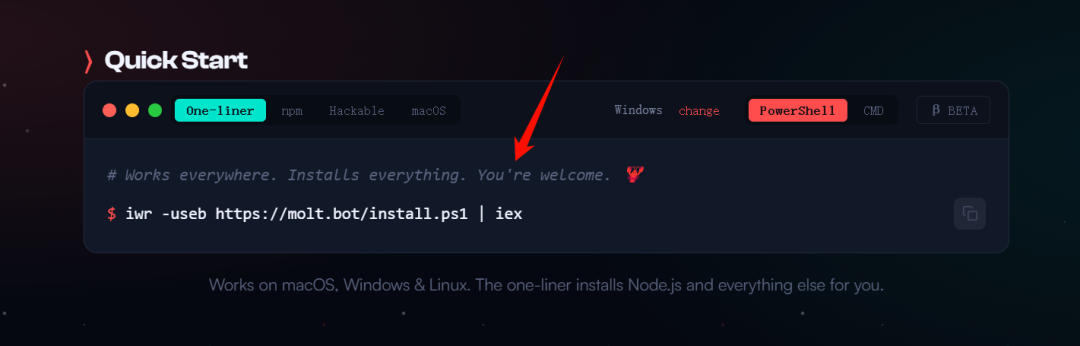 他这个安装非常简单,直接访问它的官方网站:https://clawd.bot/,然后按照你的系统选择命令。