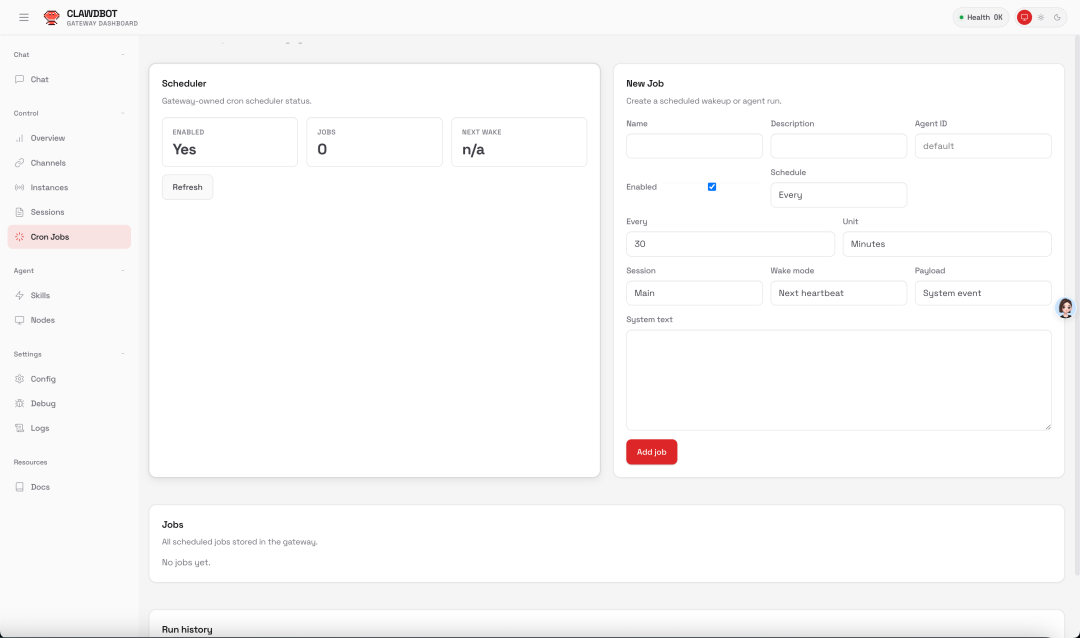 和他交互的时候,告诉他你想要怎么做就可以。你也可以在网页端的 Cron Jobs 上查看以及创建定时任务: