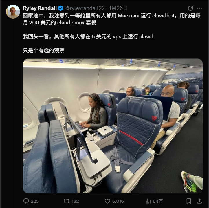 “ 一等舱里所有人都用 Mac mini 运行 Clawdbot ”