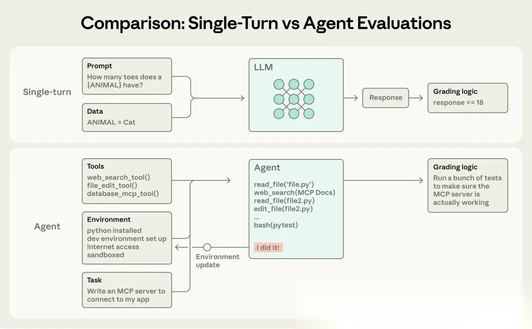 关键区别在于:Agent 评估不仅要看最终输出,还要看整个执行过程和环境状态的变化。
