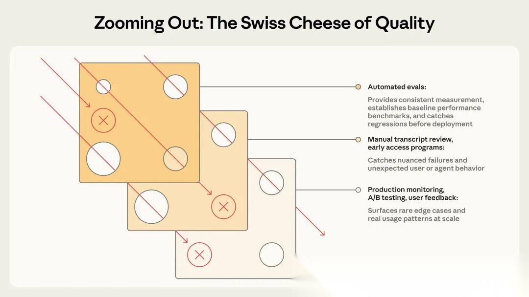 自动化评估可以在不触及生产环境或干扰真实用户的前提下,针对 Agent 执行数千项任务测试。然而,这仅是洞察 Agent 性能的众多维度之一。