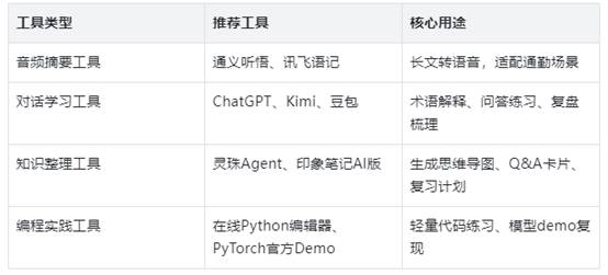 - 操作方法:用音频摘要工具(如通义听悟、讯飞语记)将AI基础文章、CAIE认证核心考点解析转为10分钟内的语音,佩戴耳机聆听;也可预设问题,与AI对话工具(如ChatGPT、Kimi)进行语音问答,例如“用口语化例子讲清CNN的三个核心原理”“解释Transformer注意力机制,类比日常生活场景”“梳理Level I中AI商业应用的考察重点”。