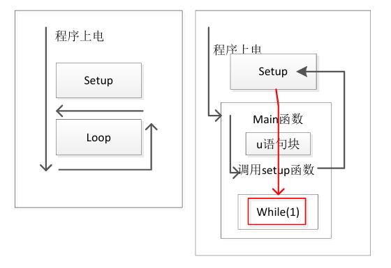 常见的c51和stm32程序是由main函数开始的,但是arduino程序的main函数定义被隐藏,用setup和loop函数进行操作。