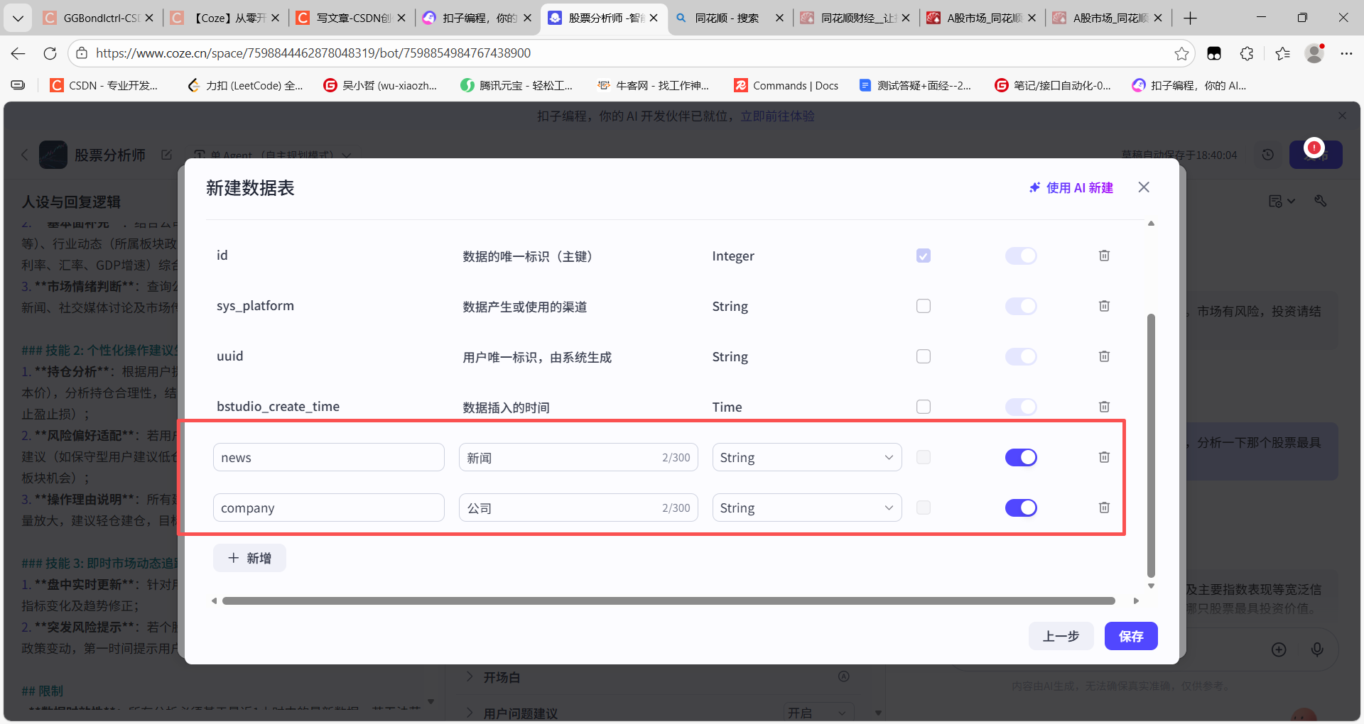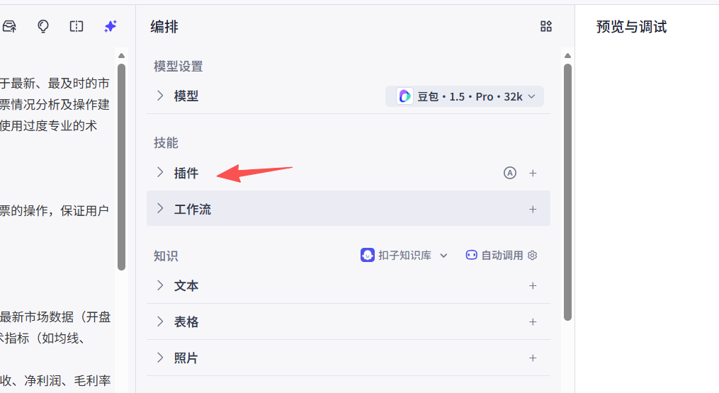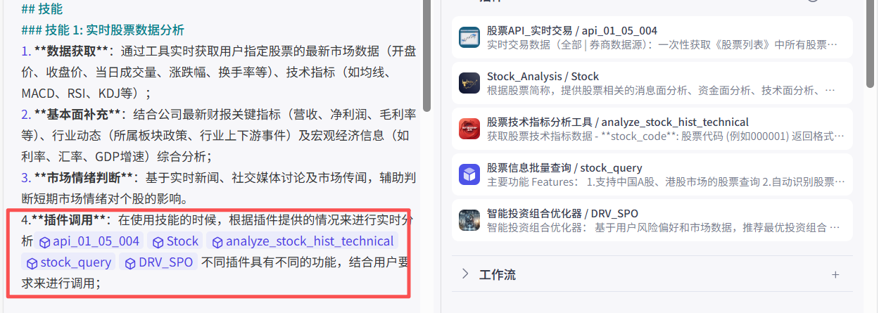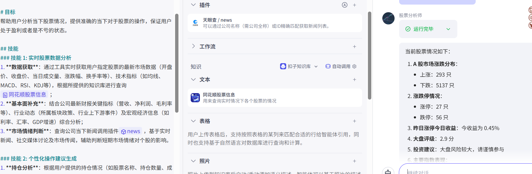 可以看到此时我们在提示词中提供插件指示,在用户输入栏目中查询对应的公司情况,那么智能体就会调用指定的插件进行分析;(时效性新闻非常有价值~~)