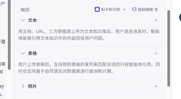 扣子资源分类:知识库,插件,数据库,音色,提示词;
