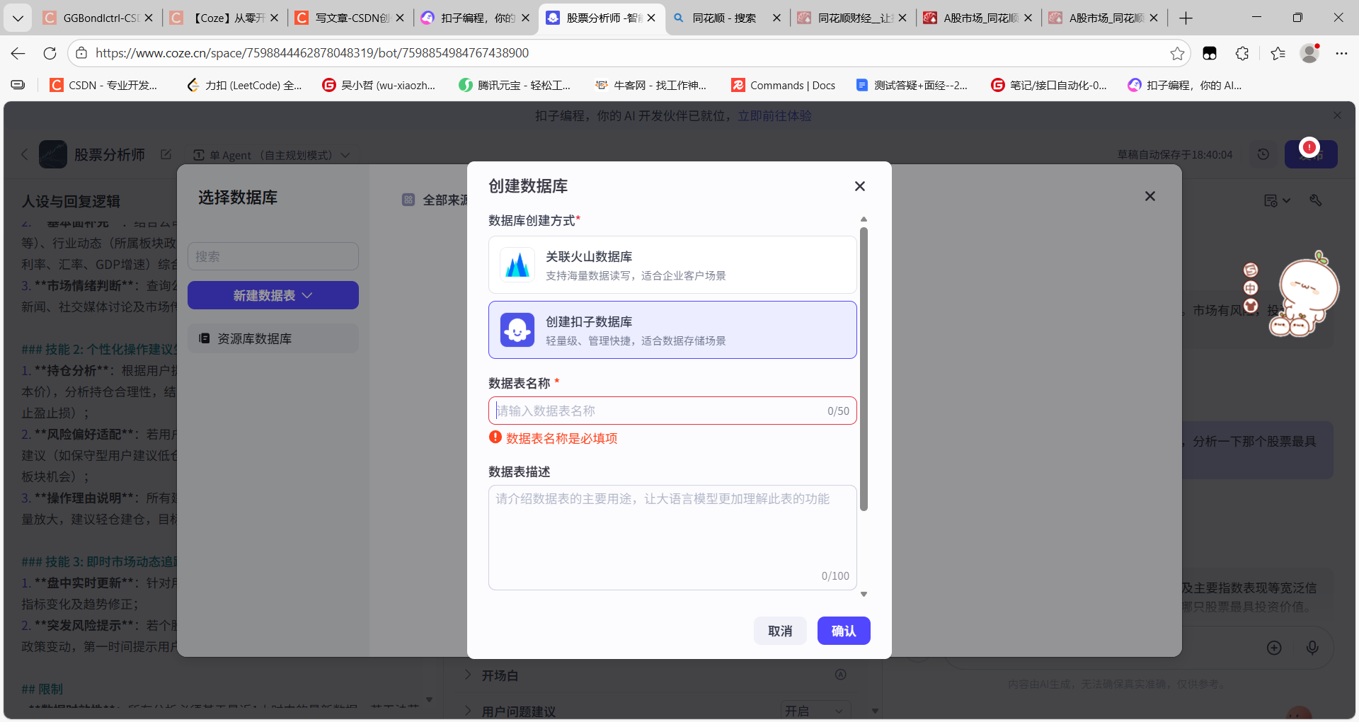 📚 Coze资源体系解析 本文系统介绍Coze平台的四大核心资源: 1️⃣ 插件:扩展智能体功能,支持实时数据查询(如天气、股票)和工具调用(如图像生成)。通过提示词指定调用逻辑,实现场景化服务。 2️⃣ 知识库:存储私有数据(如企业文档),通过RAG技术增强回答准确性,解决AI“幻觉”问题。支持文件上传、网页抓取及第三方平台集成。 3️⃣ 数据库:结构化存储服务,支持自然语言操作,实现智能体的