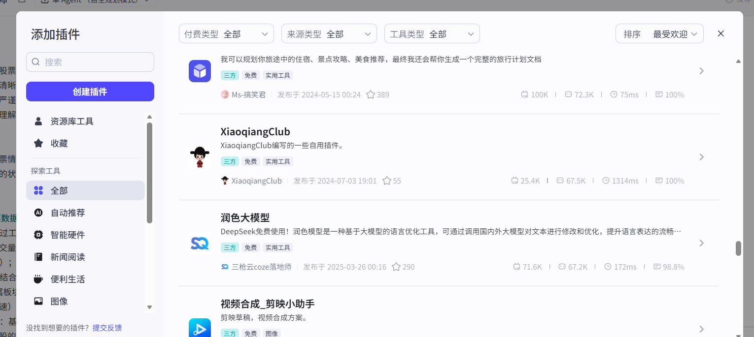 1️⃣ 插件:扩展智能体功能,支持实时数据查询(如天气、股票)和工具调用(如图像生成)。通过提示词指定调用逻辑,实现场景化服务。