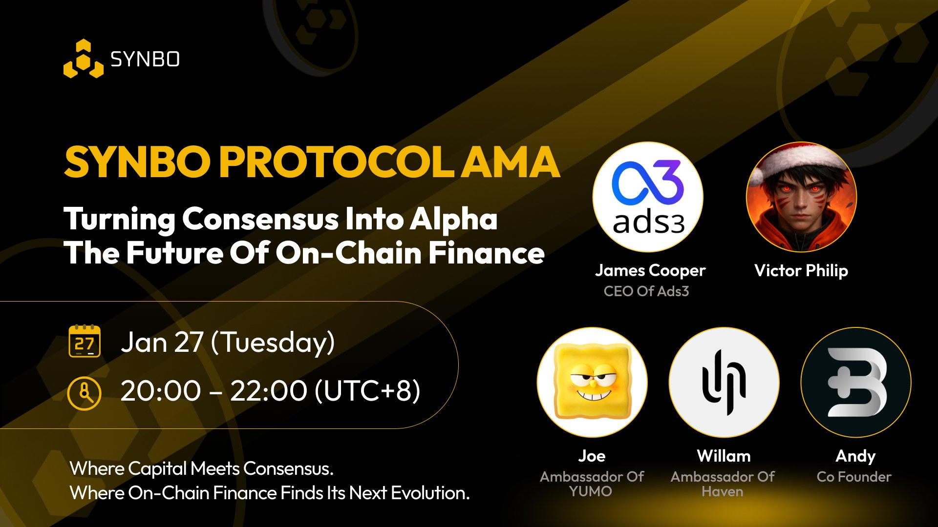 2026 年 1 月 27 日,SYNBO 在 X(Twitter Space)举办了主题为 《Turning Consensus into Alpha:The Future of On-Chain Finance》 的全球线上 AMA。