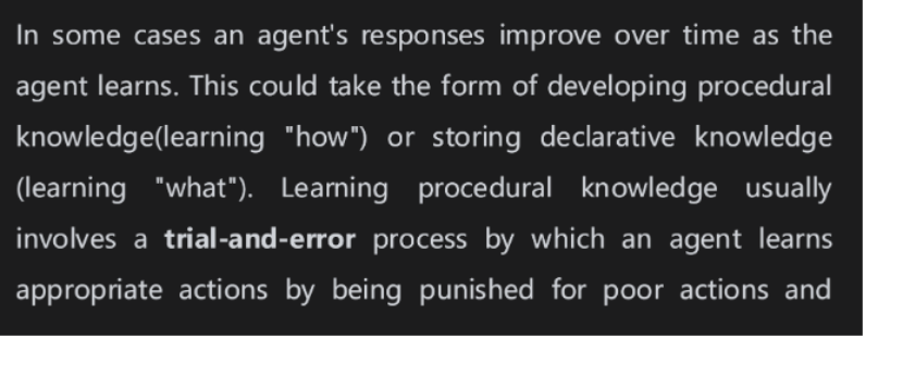 在某些情况下,随着智能体的持续学习,其反应会随时间而改善。这种进步主要通过两种形式实现:1. 学习程序性知识(学习“怎么做”);2. 学习陈述性知识(学习“是什么”)。学习“怎么做”通常涉及一个试错过程,在此过程中,如果智能体做出了错误的行为,系统会通过惩罚来告知它;反之,如果表现良好则给予奖励。
