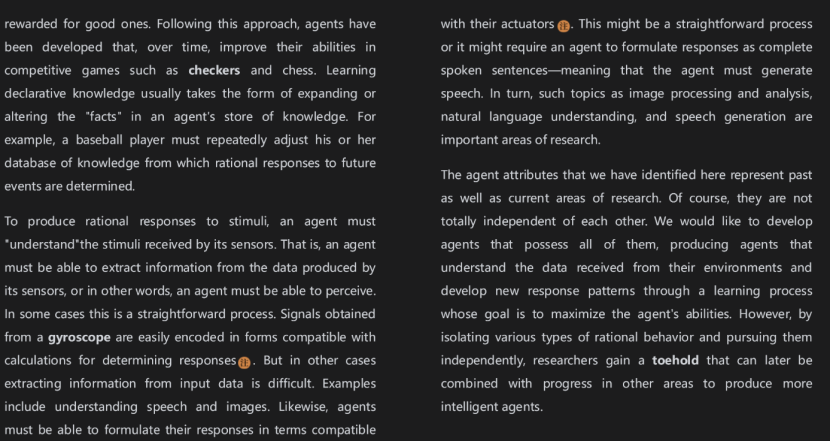我们在此确定的智能体属性代表了过去以及当前的研究领域。当然,它们并非彼此完全独立。我们希望开发出拥有所有这些属性的智能体,生产出能够理解环境数据并通过学习过程开发新反应模式的智能体,该过程的目标是最大化智能体的能力。然而,通过隔离各种类型的理性行为并独立地研究它们,研究人员获得了一个立足点,这个立足点日后可以与其他领域的进步相结合,从而制造出更智能的智能体。
