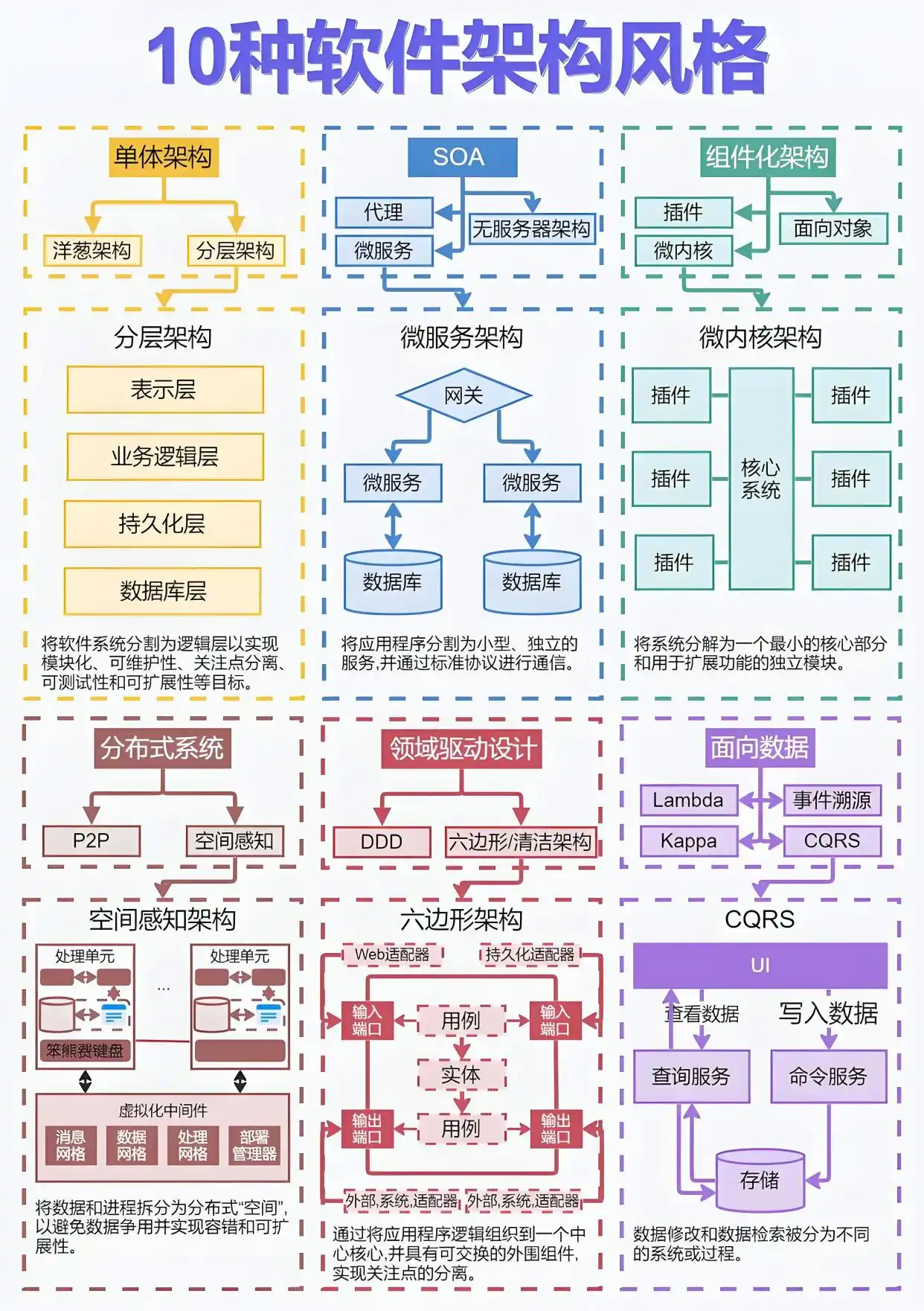 | 空间型架构 | Layered / 分层 | 系统按照职责分层(表现层、业务层、数据层),层间调用清晰 | 几乎所有企业应用 |