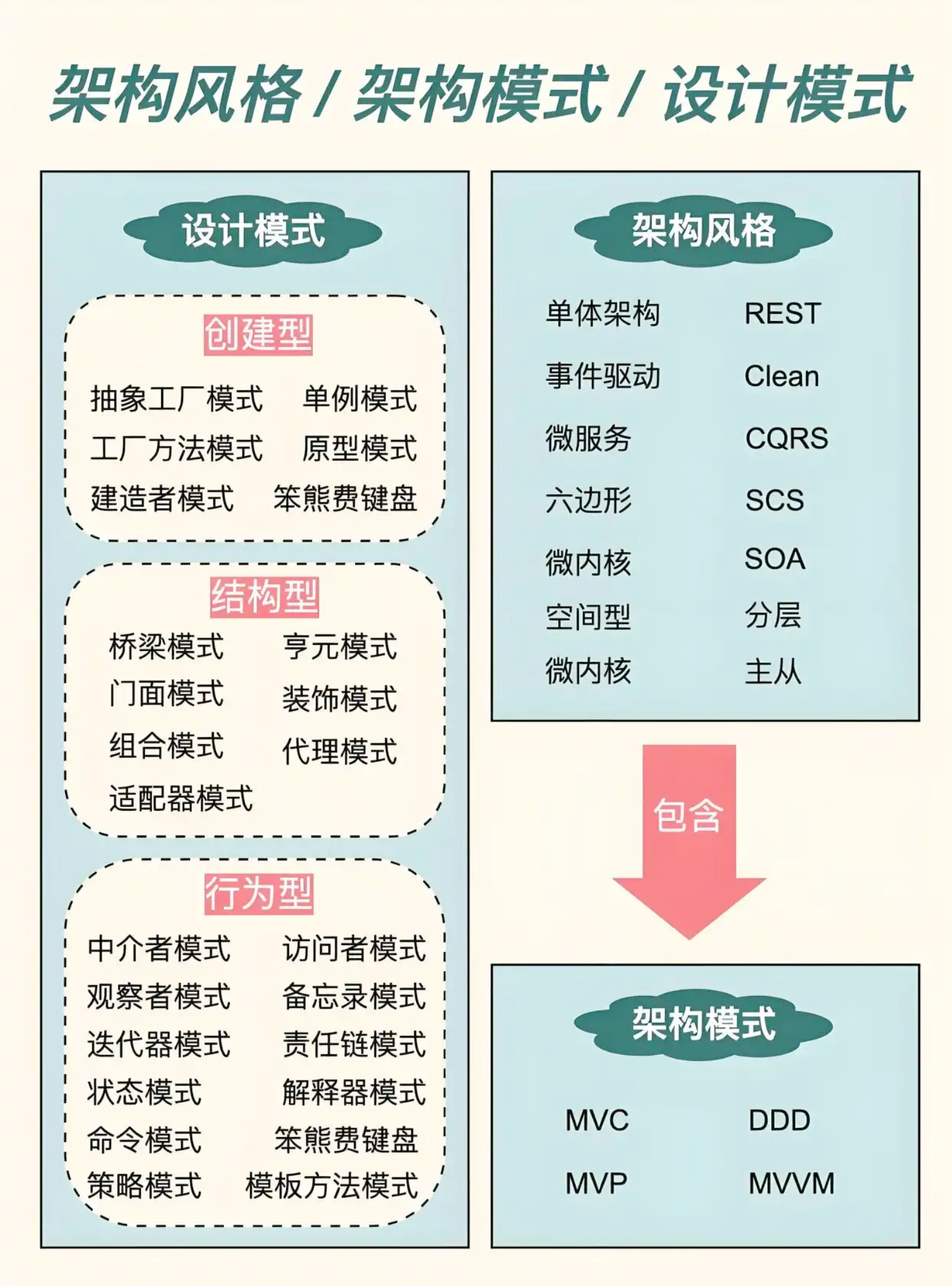 | MVC | Model-View-Controller | 分离数据模型(Model)、视图(View)、控制器(Controller);常用于 Web 和桌面应用 | Web 前端、桌面应用 |