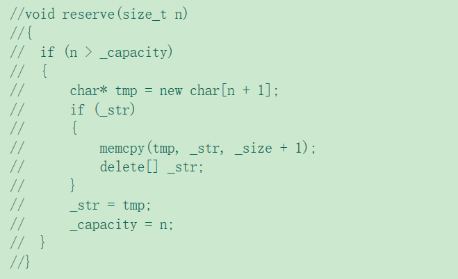 在C++中,我们一般不用于缩容(由于n<_capacity[当前容量]时,是否缩容是不确定的在计算机中要不不确定当作确定【不然会出错】所以不能用于缩容量),所以这里我们只用reserve实现扩容。
