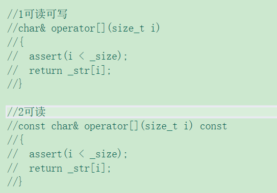 (2)顺序问题:这里如果我们三次使用strlen()函数,由于该函数是一个运行时才调用的函数,如果调用三次效率就不高,这时候就有人认为先初始化_size,在使用_size来初始化其他成员变量,但是成员变量初始化顺序是由声明是确定的,这时我们可以最先声明_size(这是一个解决方法,但是这也引出一个问题就是成员变量声明顺序是确定的[被捆绑],此时如果有一个改变了成员变量声明顺序就会引发一系列问题)显然这种方法有不行,最优解决方法是_size在初始化列表初始化,其他成员变量用已初始化的_size在函数体内初始化。