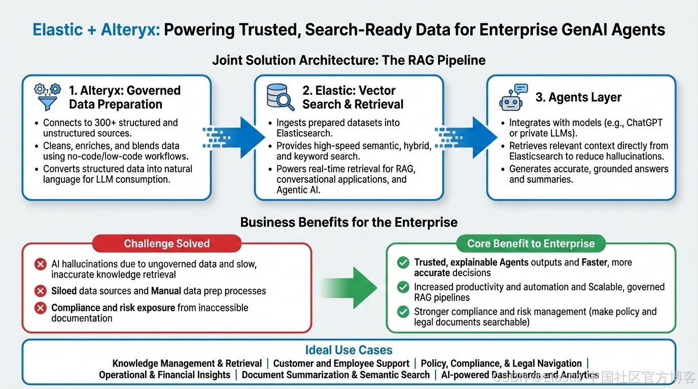 Elastic 的使命是让企业数据在 AI 规模下可探索、可操作。与 Alteryx 的合作让这一目标成为可能,确保驱动你的搜索和 agents 的数据干净、丰富且可立即使用。
