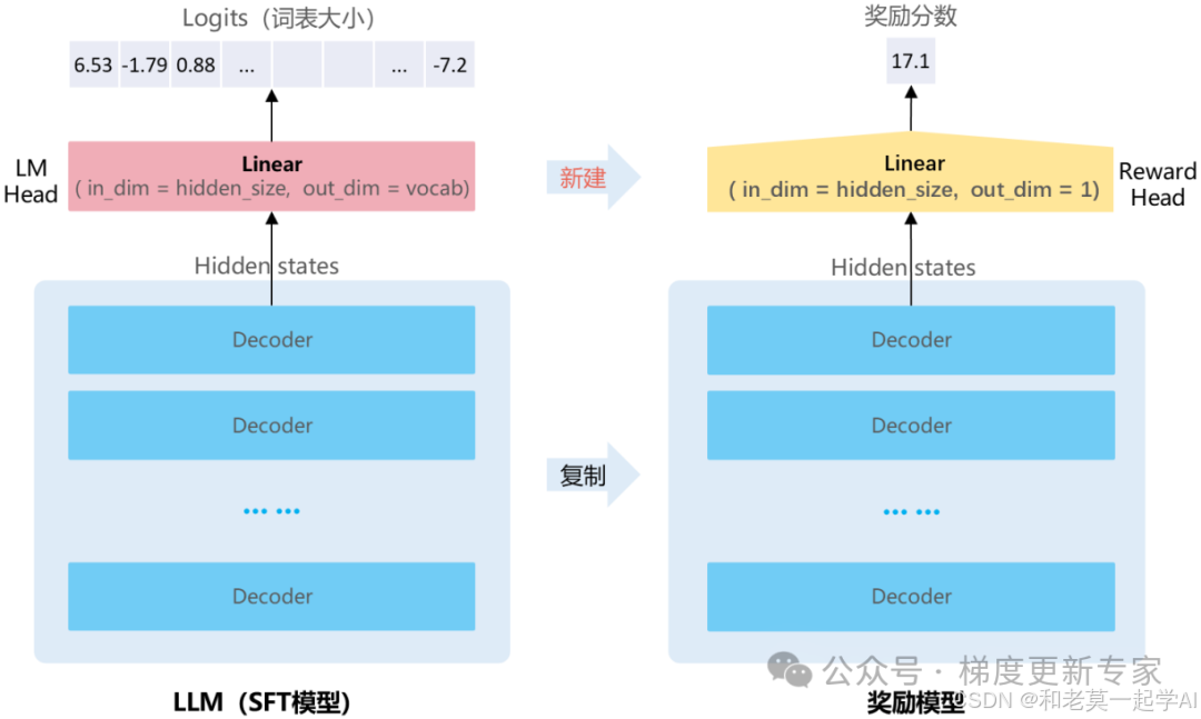 奖励模型的主干网络与SFT模型保持一致,直接复制其 Decoder 层。