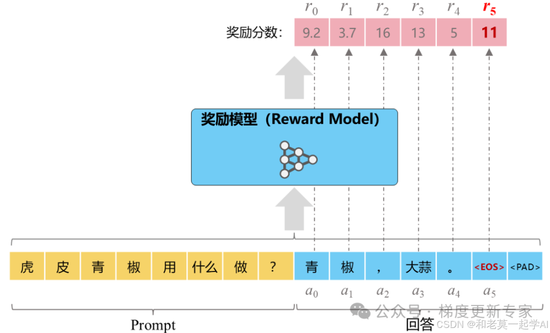 如图所示,每个回答产生一个对应的奖励分数,如 r₀=9.2、r₅=11 等。