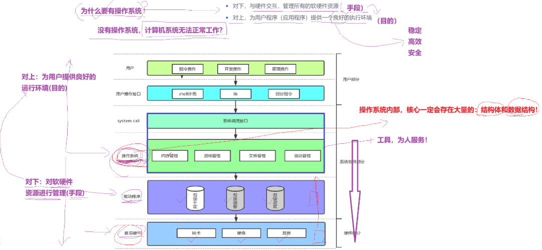- 承上:让用户 / 软件 “省心”—— 你不用懂怎么操控 CPU 寄存器、怎么读写硬盘,点一下鼠标就能启动程序,全靠 OS 把复杂的硬件操作 “包装” 成简单的指令