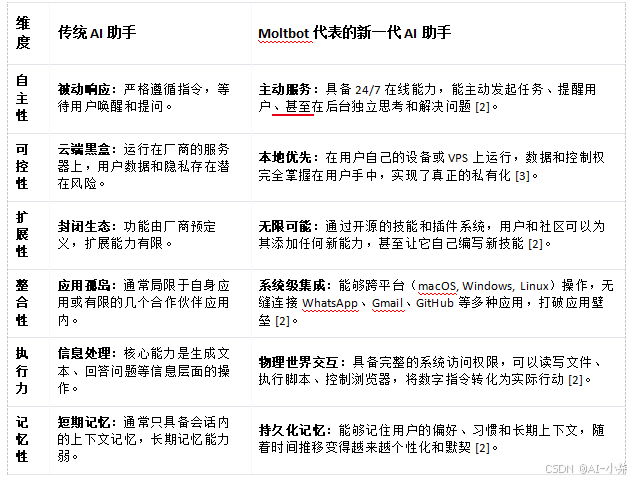 Moltbot的出现,不仅是一个产品的成功,更是对个人AI助手核心能力的一次全面重塑。它从六个关键维度上,为我们描绘了下一代AI助手的轮廓,这些维度共同构成了一个从被动工具到主动伙伴的范式转变。