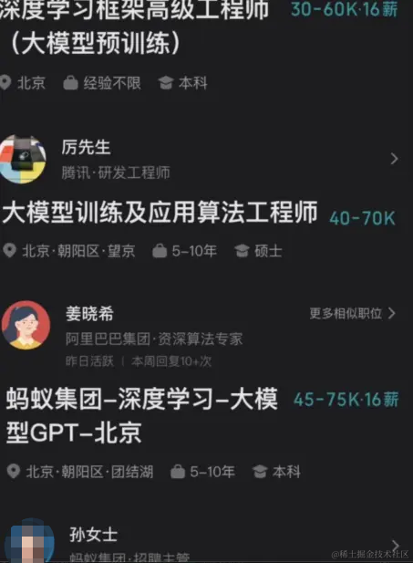BOSS直聘上,百度、腾讯、阿里、蚂蚁集团等纷纷发布了相关岗位的招聘信息。其中,百度以25-40k/月招聘AI大模型算法工程师、20-40k/月招聘模型构架工程师;蚂蚁集团以45-75k/月招聘深度学习大模型GPT工程师;阿里以40-70k/月招聘大模型训练及算法工程师;腾讯则以30-60k/月招聘大模型预训练方向的工程师… …
