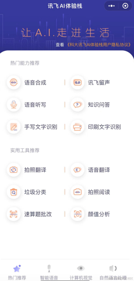 科大讯飞则是在深度神经网络算法方面拥有丰富经验,尤其在语音识别和图文识别方面水平过硬,其讯飞火星的体验页面,就包含语音合成、听写、翻译、文字识别等功能。
