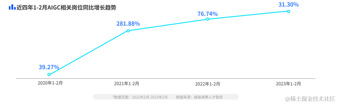 而从脉脉发布的《AIGC⼈才趋势报告》中可以看出,自Open AI推出的2021年以来,对于AIGC相关的人才争夺就已经开始了。2021年1-2月,AIGC相关岗位招聘同比上升281.88%,而后的2022年和今年的1-2月,招聘数量分别保持了76.74%和31.3%的同比增幅。