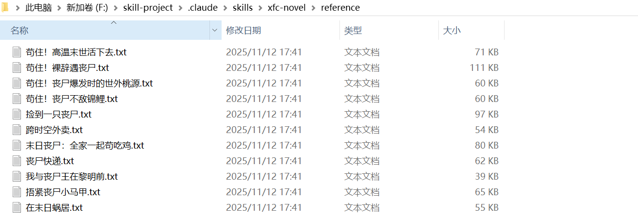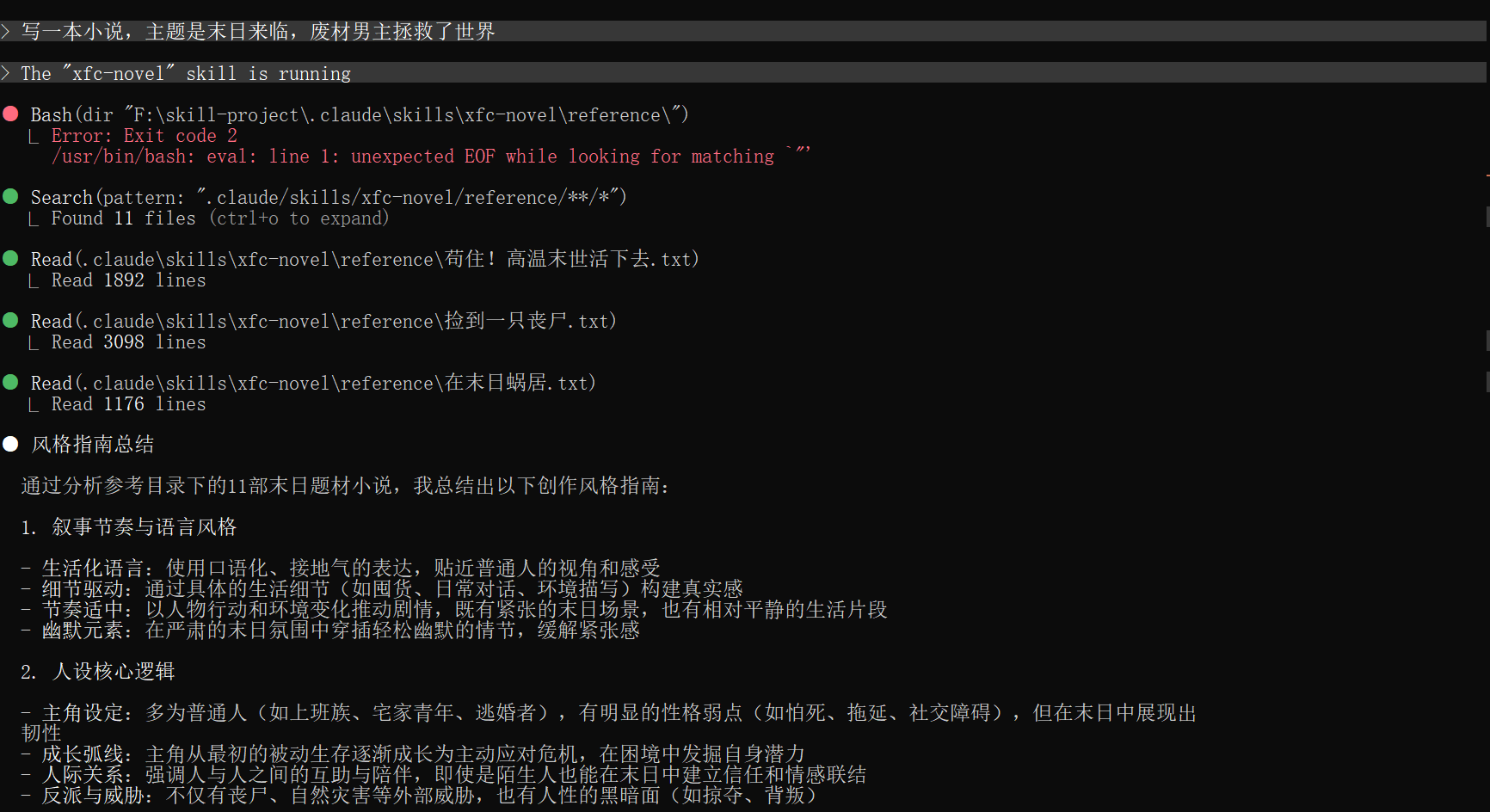可以看到图中skill第一步先开始学习领域小说,总结写作要领。