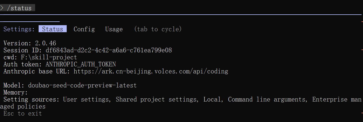 6. 进入任意项目目录,启动命令提示符,输入claude,再输入/status,按下回车可以看到当前的模型已经被切换为了Doubao-Seed-Code。