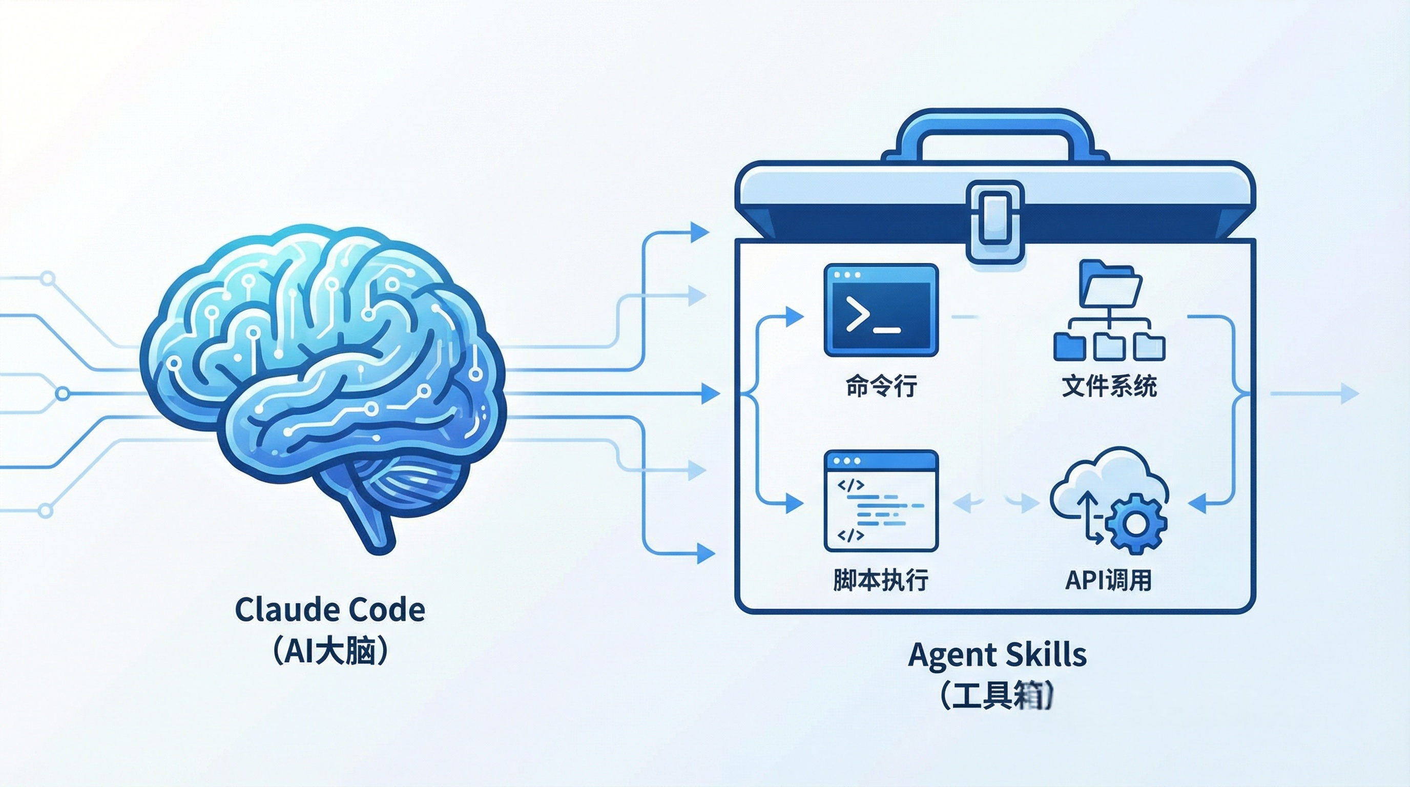 简单来说,Agent Skills是一套面向本地化 AI 能力的技能定义规范 / 框架。 如果把 Claude Code 比作 AI 的大脑,那么 Agent Skills 就是它的工具箱。它通过特定的目录结构定义任务逻辑,让 AI 不再只是空谈,而是能通过调用本地终端命令、读写文件系统、执行脚本,真正地在你的本地开发环境中干活。