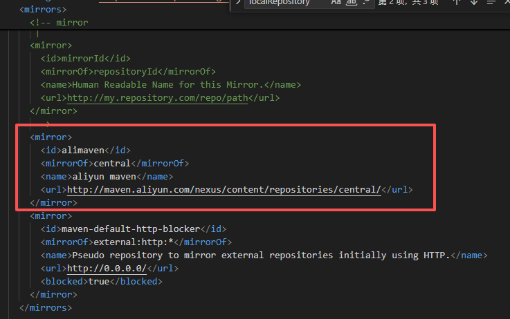 打开后在<mirrors></mirrors>标签中添加 mirror 子节点:
