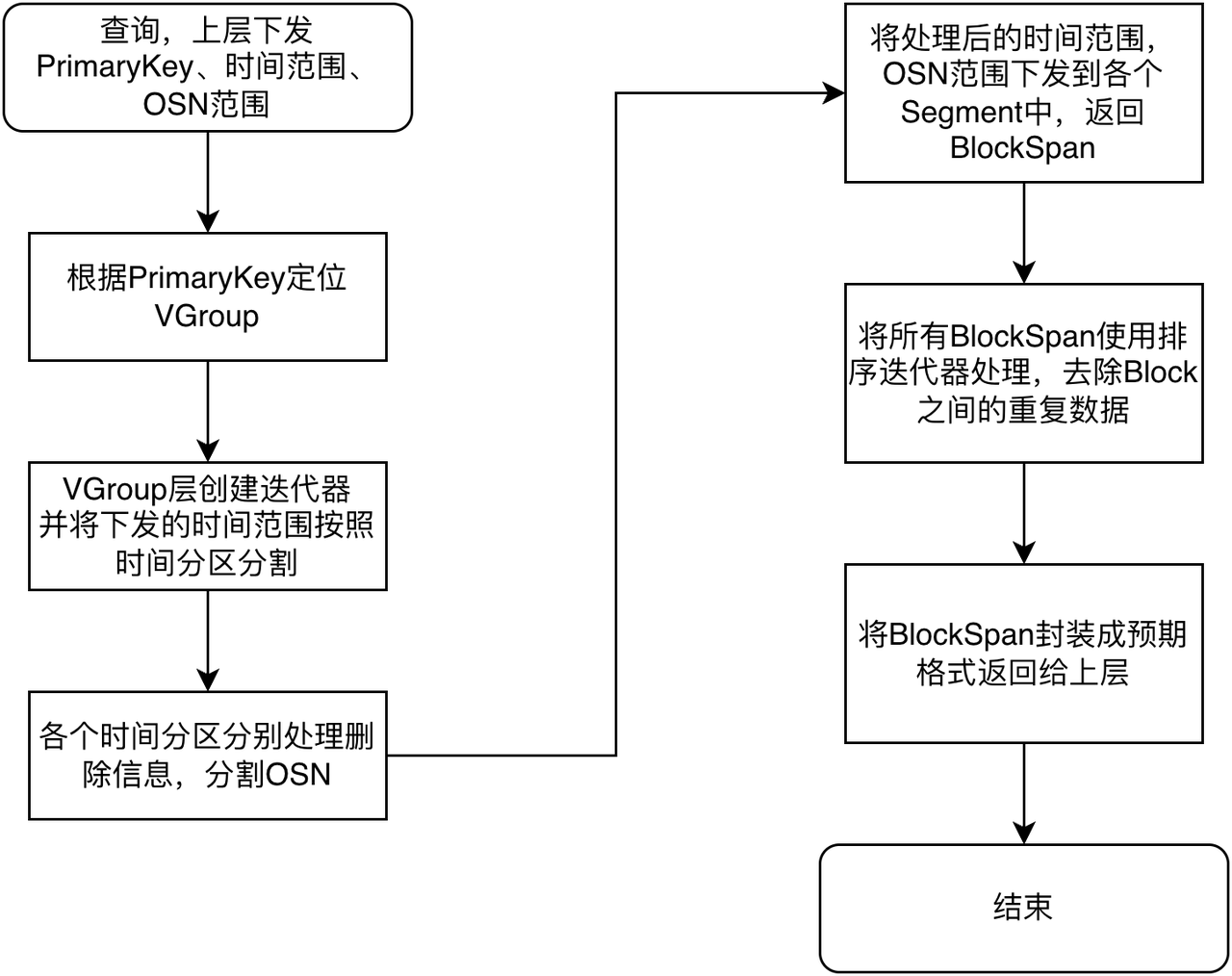 进行查询时,存储层首先按照下发的时间范围来过滤满足的时间分区,在对应的分区下逐级查询当前可见的 MemSegment、LastSegment 和 EntitySegment。此时各结构中每个 Block 内部的数据均按照设备号和时间戳升序排列。在返回给上层执行层前,这些 Block 会再经过归并排序来处理 Block 之间的重复数据,最终将经过处理的 Block 组织成合理的数据格式再返回给上层。查询的逻辑如下: