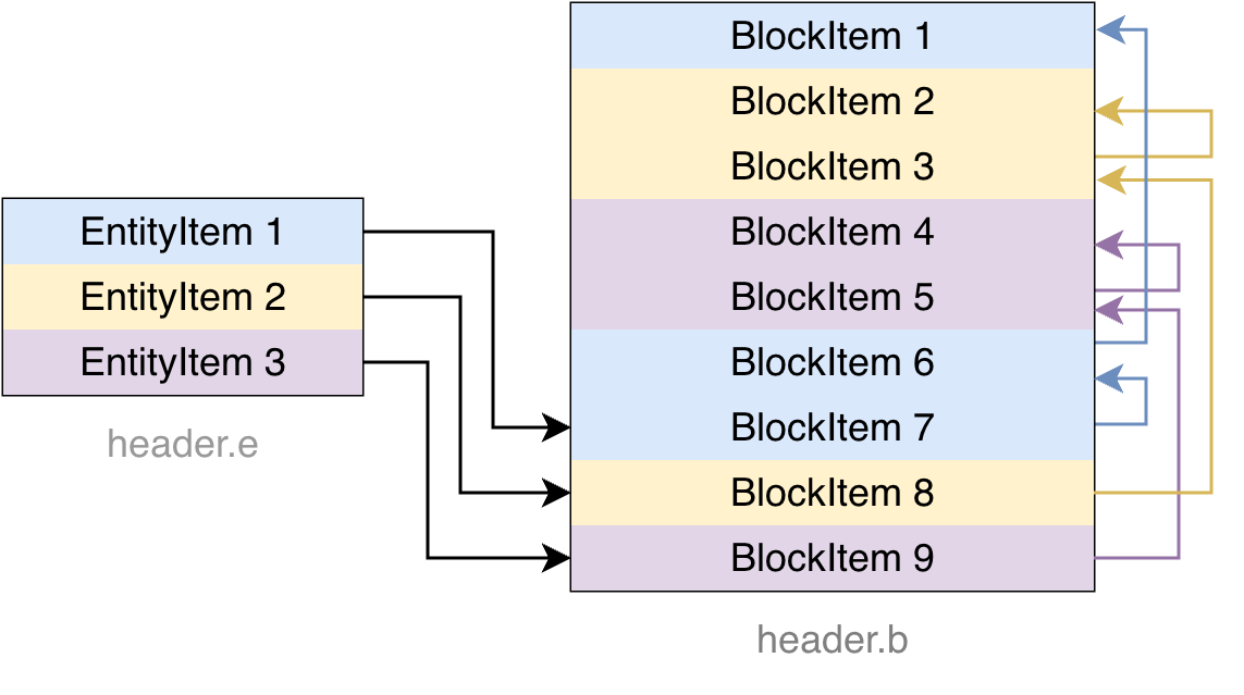 每个设备的 BlockItem 都串成一个链表。可以将 header.e 理解为记录链表头,header.b 理解为记录链表内节点,每次刷盘更新时,将链表节点追加到 header.b 文件中,同时更新 header.e 记录的链表头。Block 和 Agg 数据分别追加到 Block 和 Agg 文件中,由于 header.b 中记录了该 Block 对应的偏移,在未来可能的查询中通过 header.b 记录的 BlockItem 结构即可查询到该 Block。Block 和 Agg 的文件结构分别如下: