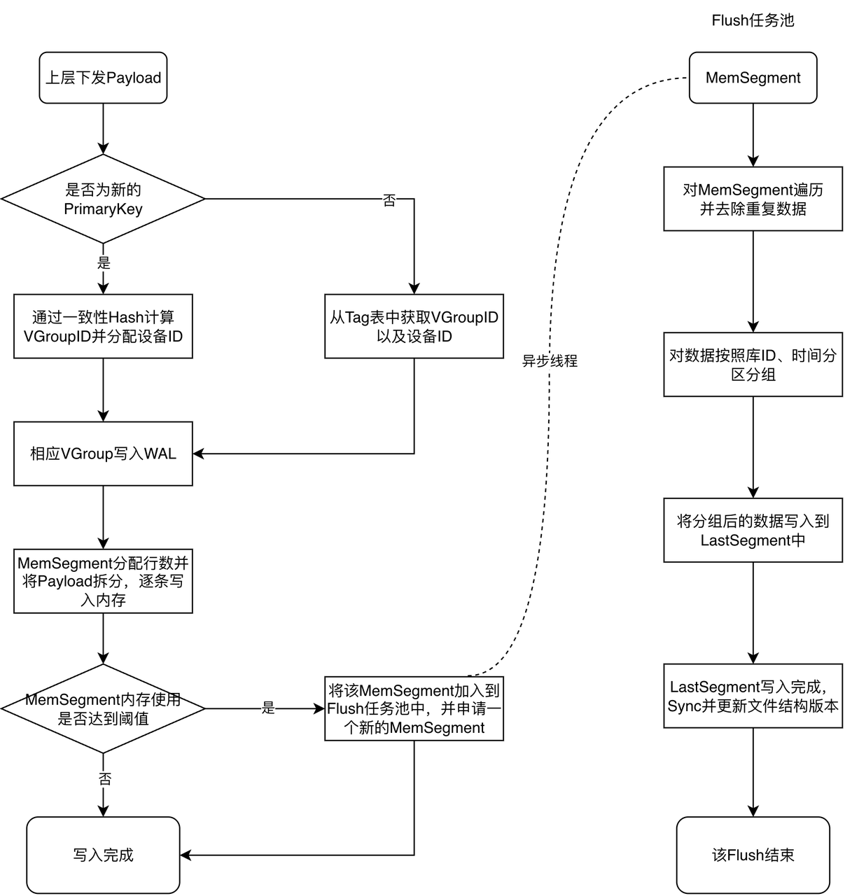数据在写入时,以行存的形式写入到 MemSegment 中,MemSegment 内部以无锁跳表的方式实现,能够高效地对写入数据按照设备 ID、时间戳、OSN(Operation Sequence Number)的方式进行排序。