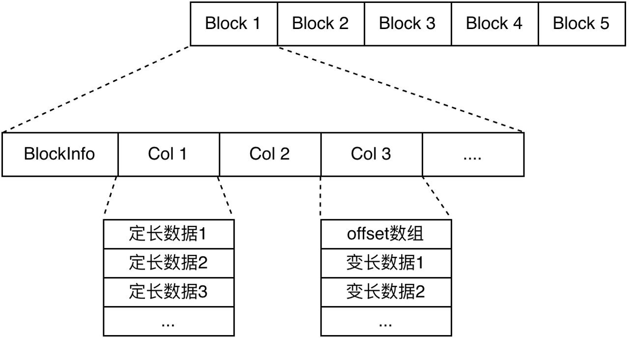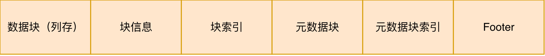 其中数据块部分用于存放列存数据,块信息部分存储如何解析数据块(记录每块中每列的偏移,数据条数等),块索引记录简单的聚合信息用于查询时的快速过滤,元数据块为可选项,以提供部分拓展支持,Footer 用于记录索引块的数量和偏移。