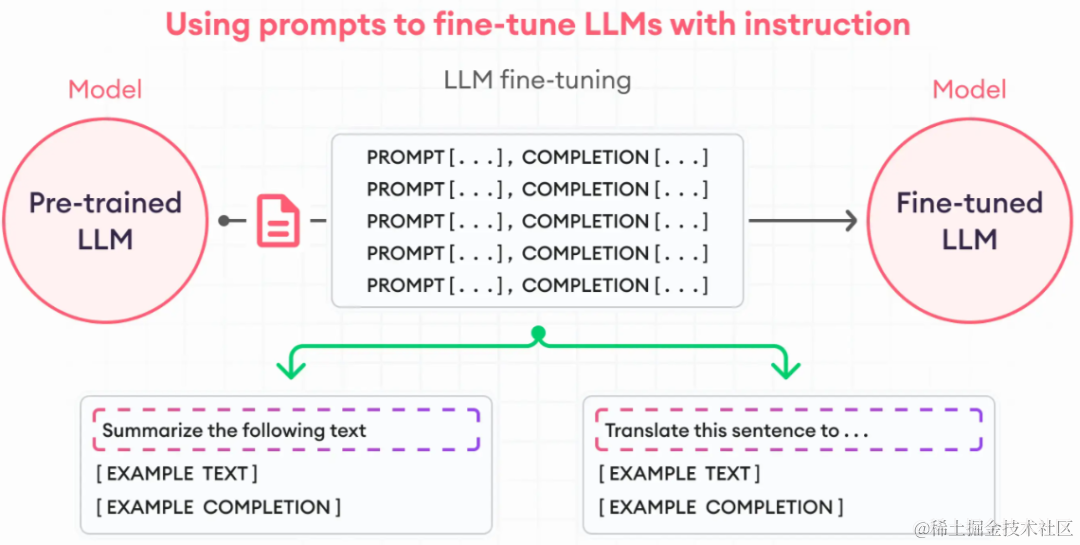 例如,如果你想提高模型的摘要能力,你应该构建一个包含摘要指令和相关文本的数据集。在翻译任务中,应包含“翻译这段文本”等指令。这些提示有助于让模型以新的专业方式“思考”,并服务于特定任务。如下图所示