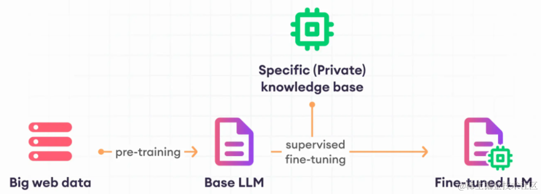 有监督微调意味着使用标记数据更新预先训练的语言模型来完成特定任务。所使用的数据已提前检查过。这与不检查数据的无监督方法不同。「通常语言模型的初始训练是无监督的,但微调是有监督的」。接下来将为您介绍大模型微调具体流程,如下图所示: