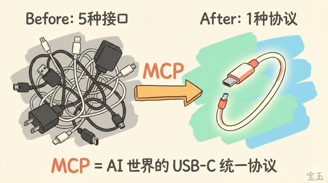 2024 年 11 月,Anthropic 开源了 MCP(Model Context Protocol,模型上下文协议)。它做的事情,和 USB-C 统一充电接口一模一样:定义一套标准协议,让任何 AI 都能即插即用地连接任何工具。