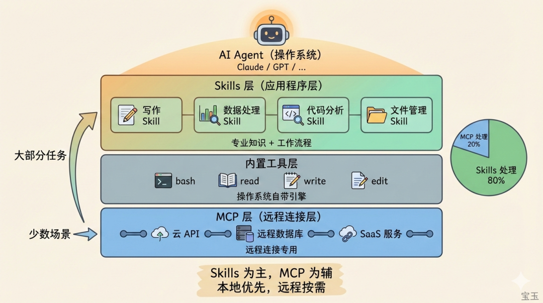 随着 Skills 生态成熟,MCP 的角色会收窄到“远程连接”这个核心场景——需要实时访问外部 API、需要认证的 SaaS 服务、需要跨网络的数据库连接。而本地文件操作、浏览器自动化、数据处理这些任务,Skills + 内置工具就能搞定,而且效率更高。