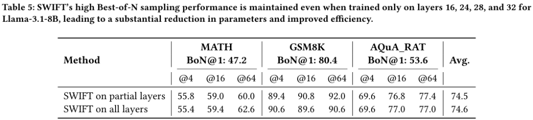 如上表所示,仅用4层信息的简化版SWIFT与全层版本的平均准确率几乎持平(74.5 vs 74.6)。