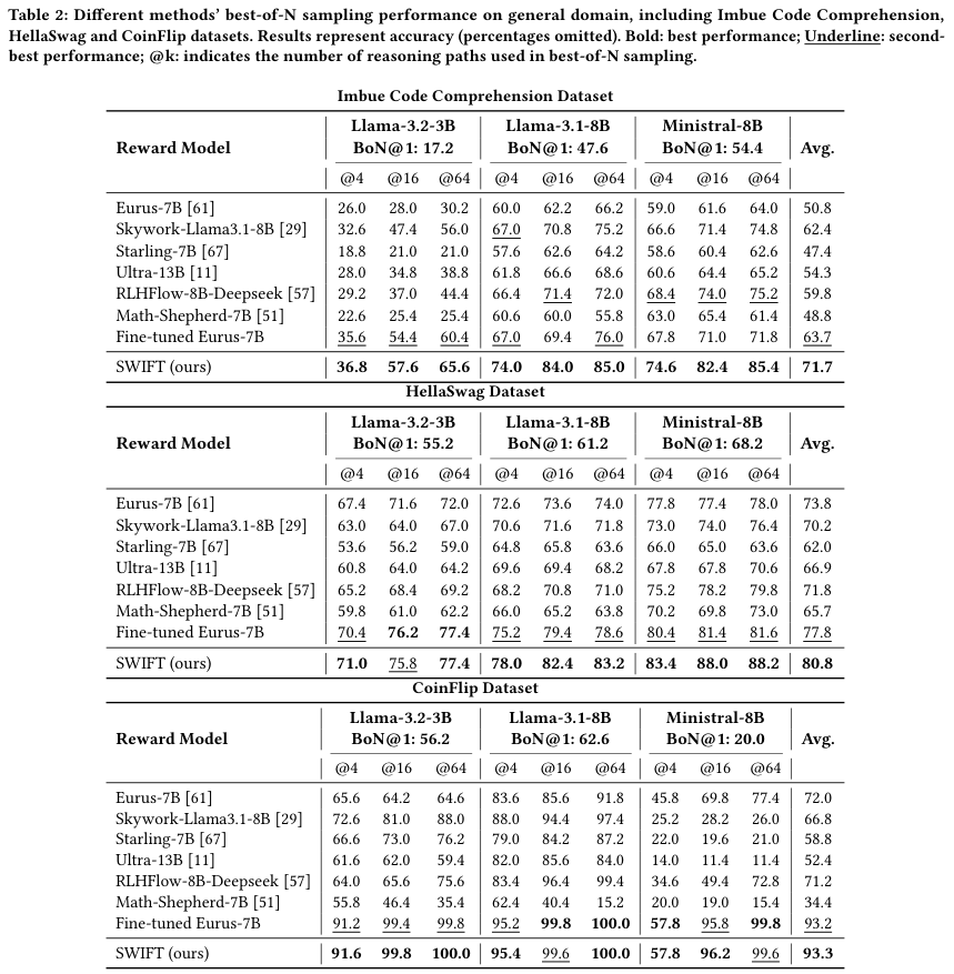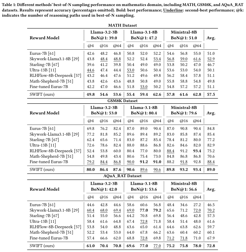 可以看到,在MATH数据集上,SWIFT的平均准确率达到了57.5%,比著名的Eurus-7B(51.0%)高出了6.5个百分点,比表现最好的基线Skywork(52.9%)也高出一大截。