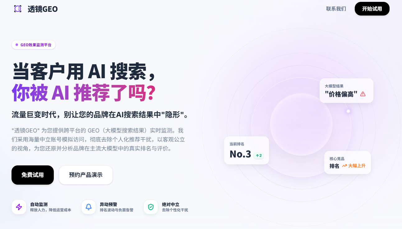 总的来说,在GEO优化的风口上,选对工具比盲目投入更重要。透镜GEO不用花钱,还能帮你把优化效果量化,避免盲目砸钱的同时守护品牌安全,对中小企业来说,确实是一款值得一试的实用工具。如果你也在做GEO优化,又不知道怎么评估效果,不妨去试试。