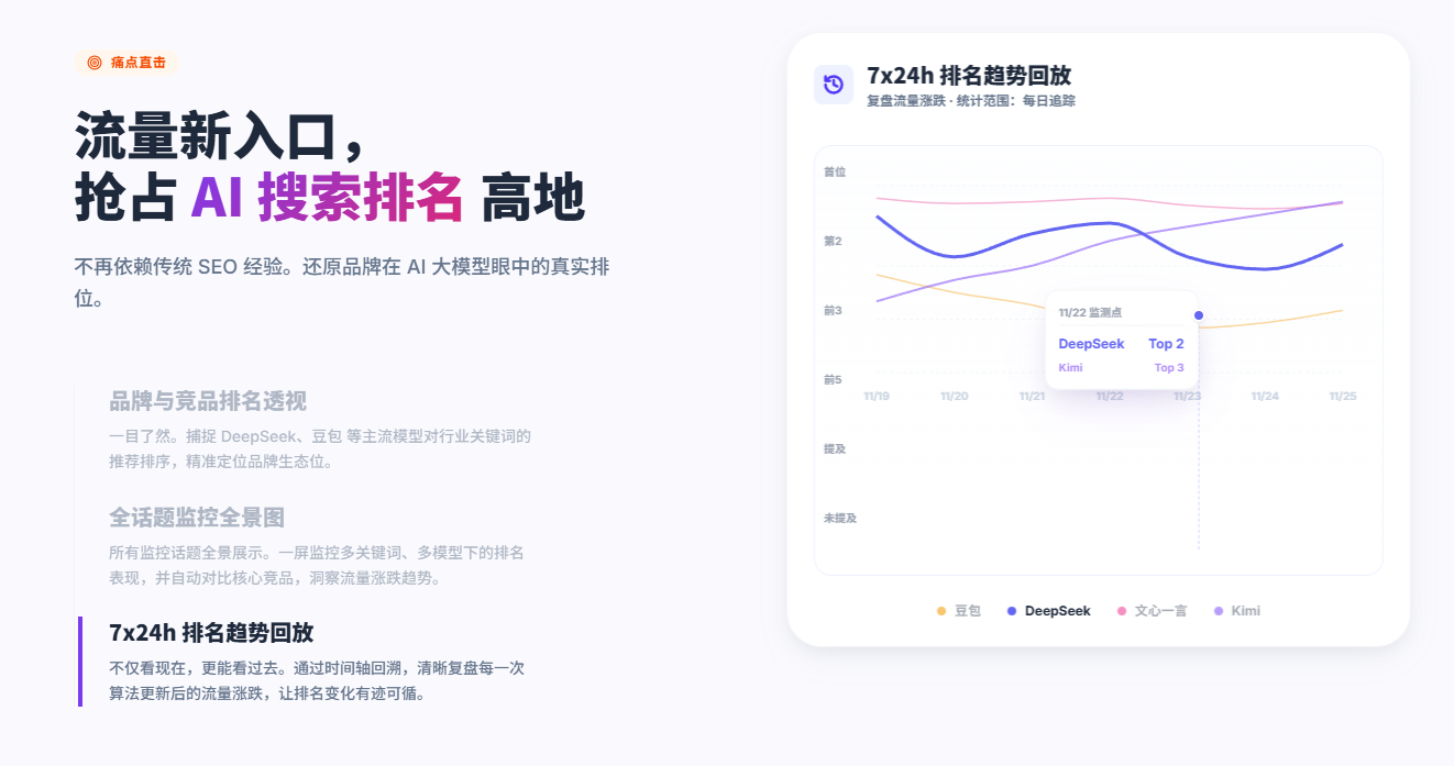 做GEO优化,最关心的就是自己的品牌、产品在AI平台上能不能被搜到,排名怎么样。以前大家都是手动去豆包、Deepseek、通义千问这些平台一个个搜,又费时间又容易遗漏,还没法跟踪变化。