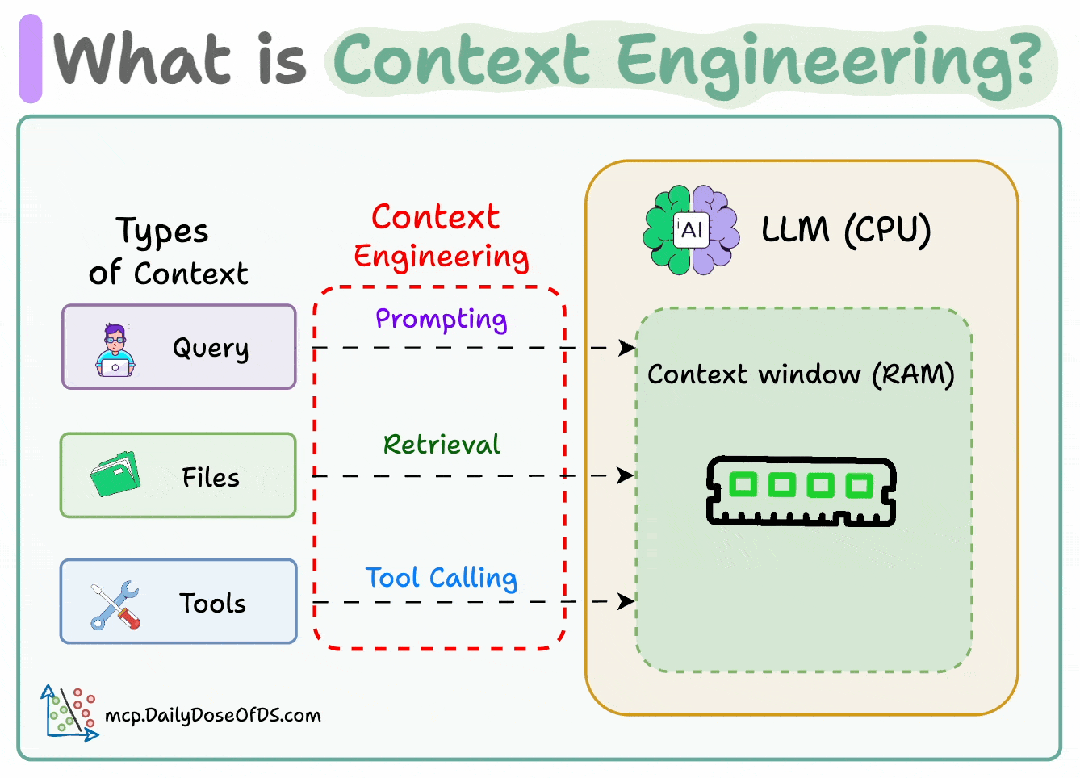 > 补充说明:这个CPU与RAM的类比,非常适合程序员理解上下文工程的价值——CPU再强,没有合适的RAM支撑(存储关键数据、指令),也无法高效运转;同理,LLM再强大,没有经过工程化设计的上下文,也难以输出精准、可用的结果。我们做上下文工程,就是优化“RAM”的存储内容,让“CPU”发挥最大价值。